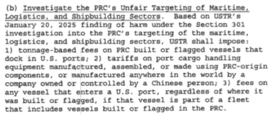 6/ 特变量行政命令草案的关键内容如下: “USTR应施加: 1)对在美国港口停靠的中国建造或悬挂旗帜的船只征收基于吨位的费用; 2)对使用中国原产地组件制造、组装或制造的港口货物处理设备,或由中国人拥有或控制的公司在世界任何地方制造的设备征收关税; 3)对任何进入美国港口的船只征收费用,无论其建造或悬挂旗帜的地点,只要该船只是包括在中国建造或悬挂旗帜的船只的船队中。