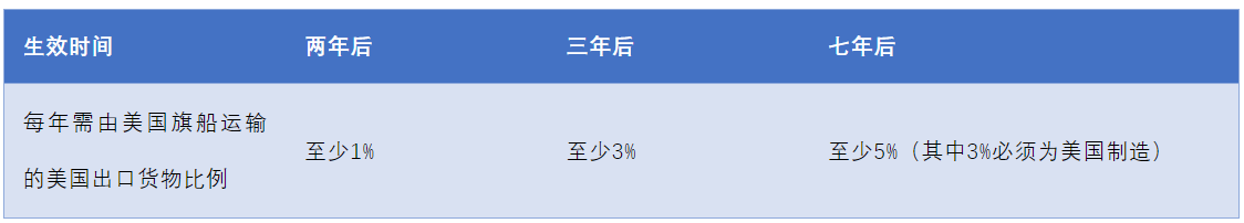 美国船公司可申请例外,前提是其运输的至少20%美国货物将在美国旗帜、美国制造船舶上运输。