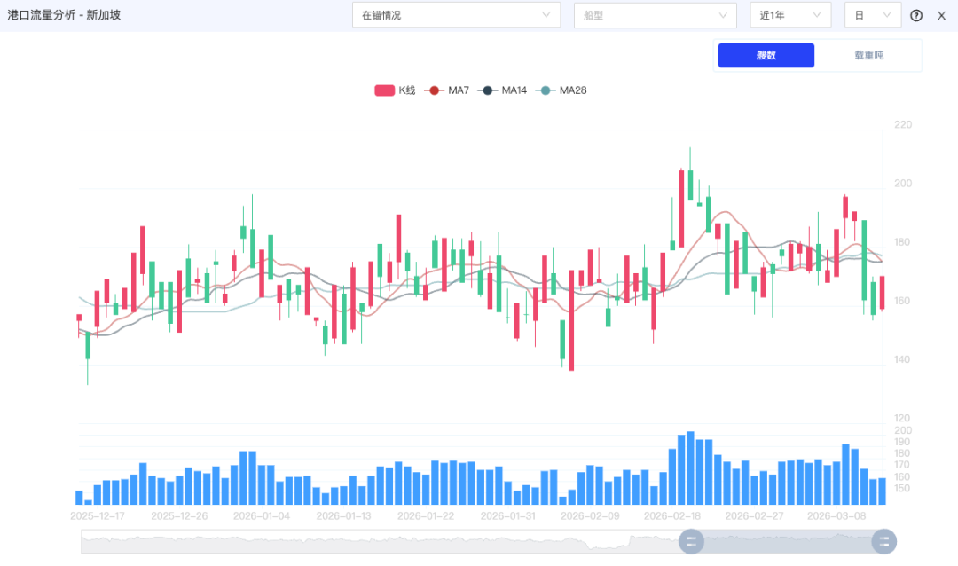 截至3月13日,新加坡港预抵1458艘,锚泊到港172艘,靠泊167艘;锚泊时长184h/平均等泊18h/作业时长22h/在港时长140h;