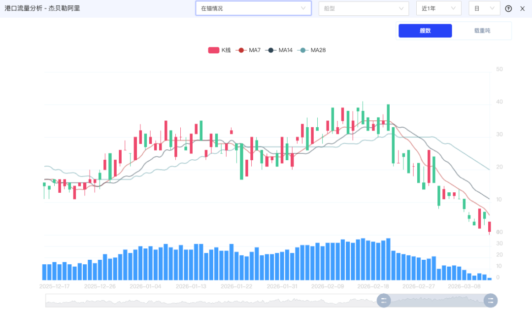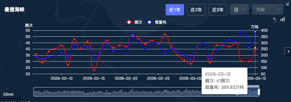 截至3月12日,曼德海峡通行艘次29艘,载重吨254.94万吨。
