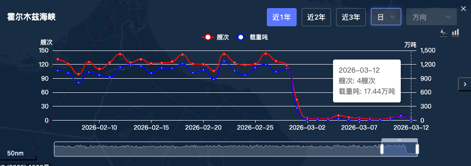 截至3月12日,霍尔木兹海峡通行艘次4艘,载重吨17.44万吨;