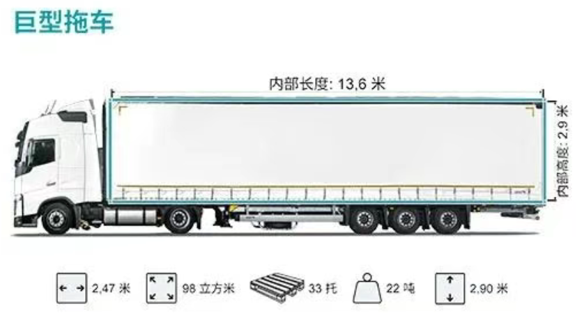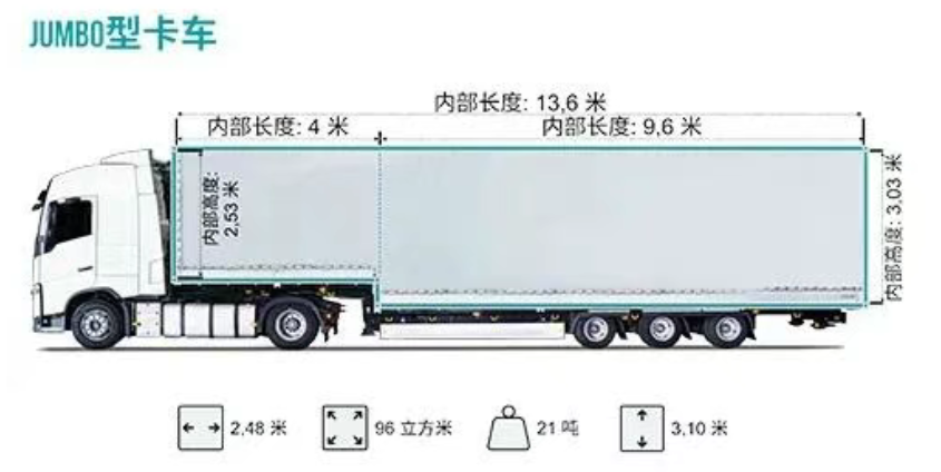 JUMBO卡车-内部可装96方,能接受打托,打托数量根据送仓地址定,承载21吨