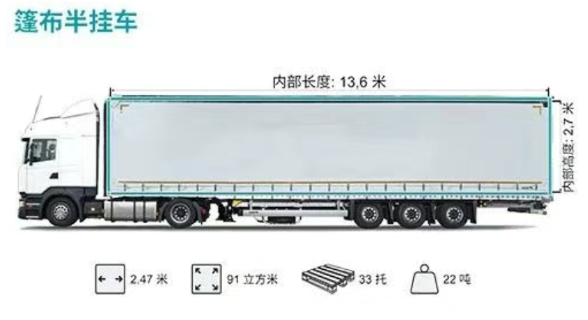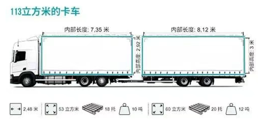 113立马米的卡车-第一个内部可装53方,18托,承载10吨,第二个内部可装60方,20托,承载20吨。