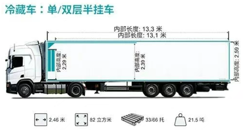冷藏车-单双层半挂车-内部可装82方,33/66托,承载21.5吨
